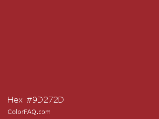 Hex #9d272d Color is a normal red color and the nearest color is Japanese Carmine #9d2933. Hex code #9d272d and RGB value is rgb(157,39,45). In RGB color space, this color is composed of 62% red, 15% green, 18% blue, In CMYK color space, this color is composed of 0% cyan, 75% magenta, 71% yellow , 38% black , In HSL color space, this color has a hue angle of 357° , 60% saturation and 38% lightness.
