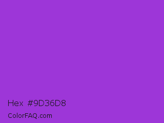 Hex #9d36d8 Color is a normal purple color and the nearest color is Dark Orchid #9932cc. Hex code #9d36d8 and RGB value is rgb(157,54,216). In RGB color space, this color is composed of 62% red, 21% green, 85% blue, In CMYK color space, this color is composed of 27% cyan, 75% magenta, 0% yellow , 15% black , In HSL color space, this color has a hue angle of 278° , 68% saturation and 53% lightness.