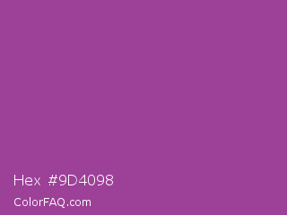 Hex #9d4098 Color is a normal magenta color and the nearest color is Plum #8e4585. Hex code #9d4098 and RGB value is rgb(157,64,152). In RGB color space, this color is composed of 62% red, 25% green, 60% blue, In CMYK color space, this color is composed of 0% cyan, 59% magenta, 3% yellow , 38% black , In HSL color space, this color has a hue angle of 303° , 42% saturation and 43% lightness.