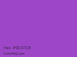 Hex #9d47c8 Color is a normal purple color and the nearest color is Deep Lilac #9955bb. Hex code #9d47c8 and RGB value is rgb(157,71,200). In RGB color space, this color is composed of 62% red, 28% green, 78% blue, In CMYK color space, this color is composed of 22% cyan, 65% magenta, 0% yellow , 22% black , In HSL color space, this color has a hue angle of 280° , 54% saturation and 53% lightness.