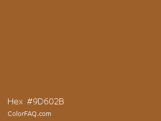 Hex #9d602b Color is a normal orange color and the nearest color is Paarl #a65529. Hex code #9d602b and RGB value is rgb(157,96,43). In RGB color space, this color is composed of 62% red, 38% green, 17% blue, In CMYK color space, this color is composed of 0% cyan, 39% magenta, 73% yellow , 38% black , In HSL color space, this color has a hue angle of 28° , 57% saturation and 39% lightness.
