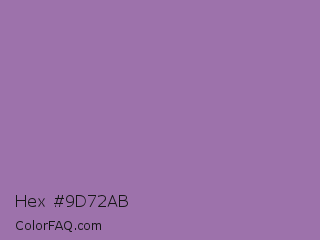 Hex #9d72ab Color is a normal purple color and the nearest color is Wisteria #9771b5. Hex code #9d72ab and RGB value is rgb(157,114,171). In RGB color space, this color is composed of 62% red, 45% green, 67% blue, In CMYK color space, this color is composed of 8% cyan, 33% magenta, 0% yellow , 33% black , In HSL color space, this color has a hue angle of 285° , 25% saturation and 56% lightness.