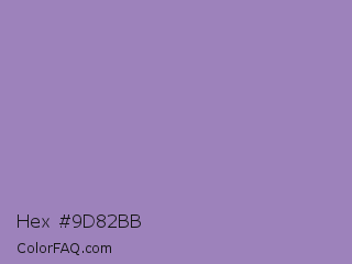 Hex #9d82bb Color is a light violet color and the nearest color is Lavender Purple #967bb6. Hex code #9d82bb and RGB value is rgb(157,130,187). In RGB color space, this color is composed of 62% red, 51% green, 73% blue, In CMYK color space, this color is composed of 16% cyan, 30% magenta, 0% yellow , 27% black , In HSL color space, this color has a hue angle of 268° , 30% saturation and 62% lightness.