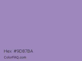 Hex #9d87ba Color is a light violet color and the nearest color is Lavender Purple #967bb6. Hex code #9d87ba and RGB value is rgb(157,135,186). In RGB color space, this color is composed of 62% red, 53% green, 73% blue, In CMYK color space, this color is composed of 16% cyan, 27% magenta, 0% yellow , 27% black , In HSL color space, this color has a hue angle of 266° , 27% saturation and 63% lightness.