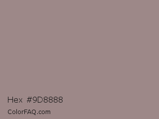 Hex #9d8888 Color is a normal red color and the nearest color is Venus #928590. Hex code #9d8888 and RGB value is rgb(157,136,136). In RGB color space, this color is composed of 62% red, 53% green, 53% blue, In CMYK color space, this color is composed of 0% cyan, 13% magenta, 13% yellow , 38% black , In HSL color space, this color has a hue angle of 0° , 10% saturation and 57% lightness.