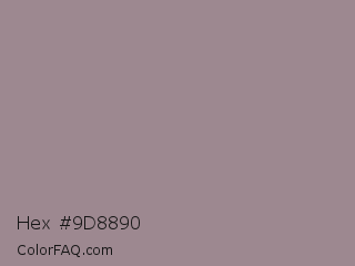 Hex #9d8890 Color is a normal rose color and the nearest color is Venus #928590. Hex code #9d8890 and RGB value is rgb(157,136,144). In RGB color space, this color is composed of 62% red, 53% green, 56% blue, In CMYK color space, this color is composed of 0% cyan, 13% magenta, 8% yellow , 38% black , In HSL color space, this color has a hue angle of 337° , 10% saturation and 57% lightness.