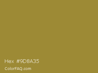 Hex #9d8a35 Color is a normal yellow color and the nearest color is Luxor Gold #a7882c. Hex code #9d8a35 and RGB value is rgb(157,138,53). In RGB color space, this color is composed of 62% red, 54% green, 21% blue, In CMYK color space, this color is composed of 0% cyan, 12% magenta, 66% yellow , 38% black , In HSL color space, this color has a hue angle of 49° , 50% saturation and 41% lightness.