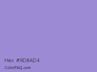 Hex #9d8ad4 Color is a light indigo color and the nearest color is Blue Bell Crayola #9999cc. Hex code #9d8ad4 and RGB value is rgb(157,138,212). In RGB color space, this color is composed of 62% red, 54% green, 83% blue, In CMYK color space, this color is composed of 26% cyan, 35% magenta, 0% yellow , 17% black , In HSL color space, this color has a hue angle of 255° , 46% saturation and 69% lightness.