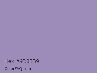 Hex #9d8bb9 Color is a light violet color and the nearest color is Amethyst Smoke #a397b4. Hex code #9d8bb9 and RGB value is rgb(157,139,185). In RGB color space, this color is composed of 62% red, 55% green, 73% blue, In CMYK color space, this color is composed of 15% cyan, 25% magenta, 0% yellow , 27% black , In HSL color space, this color has a hue angle of 263° , 25% saturation and 64% lightness.