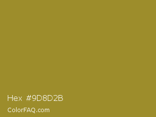 Hex #9d8d2b Color is a normal yellow color and the nearest color is Luxor Gold #a7882c. Hex code #9d8d2b and RGB value is rgb(157,141,43). In RGB color space, this color is composed of 62% red, 55% green, 17% blue, In CMYK color space, this color is composed of 0% cyan, 10% magenta, 73% yellow , 38% black , In HSL color space, this color has a hue angle of 52° , 57% saturation and 39% lightness.
