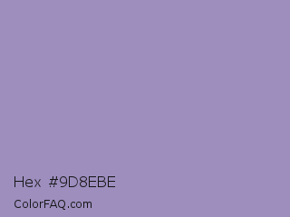Hex #9d8ebe Color is a light indigo color and the nearest color is Amethyst Smoke #a397b4. Hex code #9d8ebe and RGB value is rgb(157,142,190). In RGB color space, this color is composed of 62% red, 56% green, 75% blue, In CMYK color space, this color is composed of 17% cyan, 25% magenta, 0% yellow , 25% black , In HSL color space, this color has a hue angle of 259° , 27% saturation and 65% lightness.