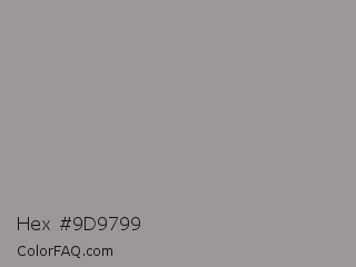 Hex #9d9799 Color is a normal rose color and the nearest color is Spanish Gray #989898. Hex code #9d9799 and RGB value is rgb(157,151,153). In RGB color space, this color is composed of 62% red, 59% green, 60% blue, In CMYK color space, this color is composed of 0% cyan, 4% magenta, 3% yellow , 38% black , In HSL color space, this color has a hue angle of 340° , 3% saturation and 60% lightness.