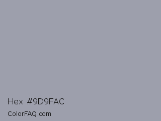 Hex #9d9fac Color is a light blue color and the nearest color is Santas Gray #9fa0b1. Hex code #9d9fac and RGB value is rgb(157,159,172). In RGB color space, this color is composed of 62% red, 62% green, 67% blue, In CMYK color space, this color is composed of 9% cyan, 8% magenta, 0% yellow , 33% black , In HSL color space, this color has a hue angle of 232° , 8% saturation and 65% lightness.