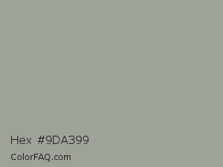 Hex #9da399 Color is a light green color and the nearest color is Star Dust #9f9f9c. Hex code #9da399 and RGB value is rgb(157,163,153). In RGB color space, this color is composed of 62% red, 64% green, 60% blue, In CMYK color space, this color is composed of 4% cyan, 0% magenta, 6% yellow , 36% black , In HSL color space, this color has a hue angle of 96° , 5% saturation and 62% lightness.