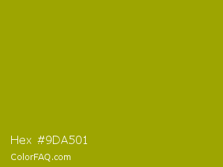 Hex #9da501 Color is a normal yellow color and the nearest color is Apple Green #8db600. Hex code #9da501 and RGB value is rgb(157,165,1). In RGB color space, this color is composed of 62% red, 65% green, 0% blue, In CMYK color space, this color is composed of 5% cyan, 0% magenta, 99% yellow , 35% black , In HSL color space, this color has a hue angle of 63° , 99% saturation and 33% lightness.