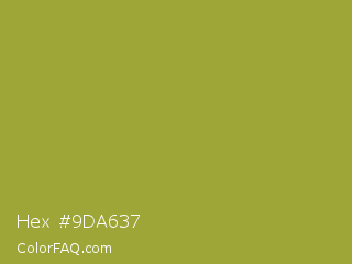 Hex #9da637 Color is a normal yellow color and the nearest color is Sushi #87ab39. Hex code #9da637 and RGB value is rgb(157,166,55). In RGB color space, this color is composed of 62% red, 65% green, 22% blue, In CMYK color space, this color is composed of 5% cyan, 0% magenta, 67% yellow , 35% black , In HSL color space, this color has a hue angle of 65° , 50% saturation and 43% lightness.