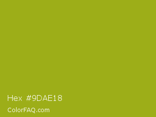 Hex #9dae18 Color is a normal yellow color and the nearest color is Citron #9fa91f. Hex code #9dae18 and RGB value is rgb(157,174,24). In RGB color space, this color is composed of 62% red, 68% green, 9% blue, In CMYK color space, this color is composed of 10% cyan, 0% magenta, 86% yellow , 32% black , In HSL color space, this color has a hue angle of 67° , 76% saturation and 39% lightness.