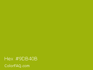 Hex #9db40b Color is a normal yellow color and the nearest color is Pistachio Green #9dc209. Hex code #9db40b and RGB value is rgb(157,180,11). In RGB color space, this color is composed of 62% red, 71% green, 4% blue, In CMYK color space, this color is composed of 13% cyan, 0% magenta, 94% yellow , 29% black , In HSL color space, this color has a hue angle of 68° , 88% saturation and 37% lightness.