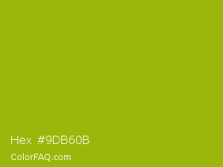Hex #9db60b Color is a normal yellow color and the nearest color is Pistachio Green #9dc209. Hex code #9db60b and RGB value is rgb(157,182,11). In RGB color space, this color is composed of 62% red, 71% green, 4% blue, In CMYK color space, this color is composed of 14% cyan, 0% magenta, 94% yellow , 29% black , In HSL color space, this color has a hue angle of 69° , 89% saturation and 38% lightness.