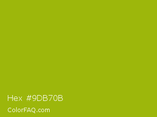 Hex #9db70b Color is a normal yellow color and the nearest color is Pistachio Green #9dc209. Hex code #9db70b and RGB value is rgb(157,183,11). In RGB color space, this color is composed of 62% red, 72% green, 4% blue, In CMYK color space, this color is composed of 14% cyan, 0% magenta, 94% yellow , 28% black , In HSL color space, this color has a hue angle of 69° , 89% saturation and 38% lightness.