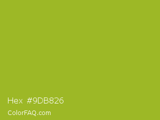 Hex #9db826 Color is a normal lime color and the nearest color is Citron #9fa91f. Hex code #9db826 and RGB value is rgb(157,184,38). In RGB color space, this color is composed of 62% red, 72% green, 15% blue, In CMYK color space, this color is composed of 15% cyan, 0% magenta, 79% yellow , 28% black , In HSL color space, this color has a hue angle of 71° , 66% saturation and 44% lightness.