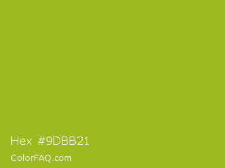 Hex #9dbb21 Color is a normal lime color and the nearest color is Citron #9fa91f. Hex code #9dbb21 and RGB value is rgb(157,187,33). In RGB color space, this color is composed of 62% red, 73% green, 13% blue, In CMYK color space, this color is composed of 16% cyan, 0% magenta, 82% yellow , 27% black , In HSL color space, this color has a hue angle of 72° , 70% saturation and 43% lightness.