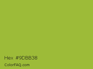 Hex #9dbb38 Color is a normal lime color and the nearest color is Android Green #a4c639. Hex code #9dbb38 and RGB value is rgb(157,187,56). In RGB color space, this color is composed of 62% red, 73% green, 22% blue, In CMYK color space, this color is composed of 16% cyan, 0% magenta, 70% yellow , 27% black , In HSL color space, this color has a hue angle of 74° , 54% saturation and 48% lightness.