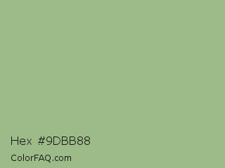 Hex #9dbb88 Color is a light green color and the nearest color is Dark Sea Green #8fbc8f. Hex code #9dbb88 and RGB value is rgb(157,187,136). In RGB color space, this color is composed of 62% red, 73% green, 53% blue, In CMYK color space, this color is composed of 16% cyan, 0% magenta, 27% yellow , 27% black , In HSL color space, this color has a hue angle of 95° , 27% saturation and 63% lightness.