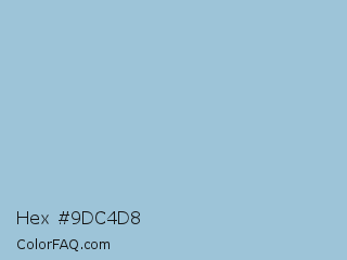 Hex #9dc4d8 Color is a light blue color and the nearest color is Pale Cerulean #9bc4e2. Hex code #9dc4d8 and RGB value is rgb(157,196,216). In RGB color space, this color is composed of 62% red, 77% green, 85% blue, In CMYK color space, this color is composed of 27% cyan, 9% magenta, 0% yellow , 15% black , In HSL color space, this color has a hue angle of 200° , 43% saturation and 73% lightness.