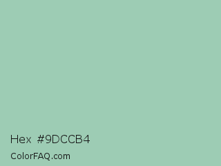 Hex #9dccb4 Color is a light green color and the nearest color is Turquoise Green #a0d6b4. Hex code #9dccb4 and RGB value is rgb(157,204,180). In RGB color space, this color is composed of 62% red, 80% green, 71% blue, In CMYK color space, this color is composed of 23% cyan, 0% magenta, 12% yellow , 20% black , In HSL color space, this color has a hue angle of 149° , 32% saturation and 71% lightness.