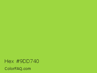 Hex #9dd740 Color is a normal green color and the nearest color is Yellow Green #9acd32. Hex code #9dd740 and RGB value is rgb(157,215,64). In RGB color space, this color is composed of 62% red, 84% green, 25% blue, In CMYK color space, this color is composed of 27% cyan, 0% magenta, 70% yellow , 16% black , In HSL color space, this color has a hue angle of 83° , 65% saturation and 55% lightness.