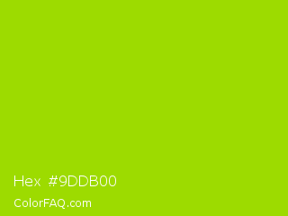 Hex #9ddb00 Color is a normal lime color and the nearest color is Vivid Lime Green #a6d608. Hex code #9ddb00 and RGB value is rgb(157,219,0). In RGB color space, this color is composed of 62% red, 86% green, 0% blue, In CMYK color space, this color is composed of 28% cyan, 0% magenta, 100% yellow , 14% black , In HSL color space, this color has a hue angle of 77° , 100% saturation and 43% lightness.