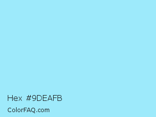 Hex #9deafb Color is a light cyan color and the nearest color is Anakiwa #9de5ff. Hex code #9deafb and RGB value is rgb(157,234,251). In RGB color space, this color is composed of 62% red, 92% green, 98% blue, In CMYK color space, this color is composed of 37% cyan, 7% magenta, 0% yellow , 2% black , In HSL color space, this color has a hue angle of 191° , 92% saturation and 80% lightness.