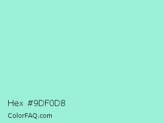 Hex #9df0d8 Color is a light green color and the nearest color is Water Leaf #a1e9de. Hex code #9df0d8 and RGB value is rgb(157,240,216). In RGB color space, this color is composed of 62% red, 94% green, 85% blue, In CMYK color space, this color is composed of 35% cyan, 0% magenta, 10% yellow , 6% black , In HSL color space, this color has a hue angle of 163° , 73% saturation and 78% lightness.