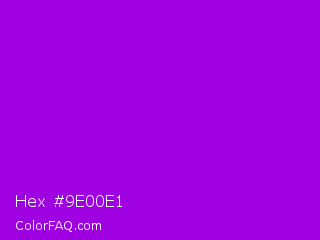 Hex #9e00e1 Color is a normal purple color and the nearest color is Dark Violet #9400d3. Hex code #9e00e1 and RGB value is rgb(158,0,225). In RGB color space, this color is composed of 62% red, 0% green, 88% blue, In CMYK color space, this color is composed of 30% cyan, 100% magenta, 0% yellow , 12% black , In HSL color space, this color has a hue angle of 282° , 100% saturation and 44% lightness.