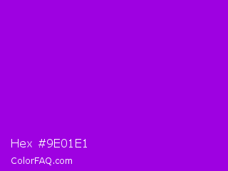 Hex #9e01e1 Color is a normal purple color and the nearest color is Dark Violet #9400d3. Hex code #9e01e1 and RGB value is rgb(158,1,225). In RGB color space, this color is composed of 62% red, 0% green, 88% blue, In CMYK color space, this color is composed of 30% cyan, 100% magenta, 0% yellow , 12% black , In HSL color space, this color has a hue angle of 282° , 99% saturation and 44% lightness.