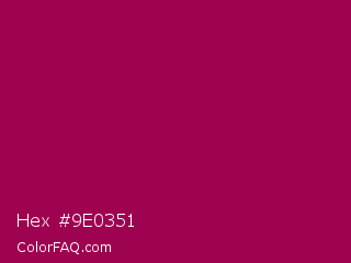 Hex #9e0351 Color is a normal rose color and the nearest color is Jazzberry Jam #a50b5e. Hex code #9e0351 and RGB value is rgb(158,3,81). In RGB color space, this color is composed of 62% red, 1% green, 32% blue, In CMYK color space, this color is composed of 0% cyan, 98% magenta, 49% yellow , 38% black , In HSL color space, this color has a hue angle of 330° , 96% saturation and 32% lightness.