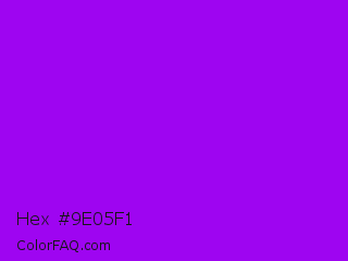 Hex #9e05f1 Color is a normal purple color and the nearest color is Vivid Violet #9f00ff. Hex code #9e05f1 and RGB value is rgb(158,5,241). In RGB color space, this color is composed of 62% red, 2% green, 95% blue, In CMYK color space, this color is composed of 34% cyan, 98% magenta, 0% yellow , 5% black , In HSL color space, this color has a hue angle of 279° , 96% saturation and 48% lightness.