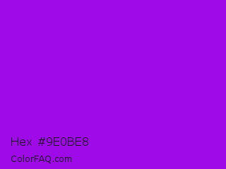 Hex #9e0be8 Color is a normal purple color and the nearest color is Veronica #a020f0. Hex code #9e0be8 and RGB value is rgb(158,11,232). In RGB color space, this color is composed of 62% red, 4% green, 91% blue, In CMYK color space, this color is composed of 32% cyan, 95% magenta, 0% yellow , 9% black , In HSL color space, this color has a hue angle of 280° , 91% saturation and 48% lightness.