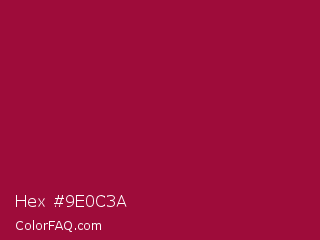 Hex #9e0c3a Color is a normal rose color and the nearest color is Pink Raspberry #980036. Hex code #9e0c3a and RGB value is rgb(158,12,58). In RGB color space, this color is composed of 62% red, 5% green, 23% blue, In CMYK color space, this color is composed of 0% cyan, 92% magenta, 63% yellow , 38% black , In HSL color space, this color has a hue angle of 341° , 86% saturation and 33% lightness.