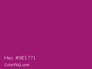 Hex #9e1771 Color is a normal magenta color and the nearest color is Amaranth Deep Purple #9f2b68. Hex code #9e1771 and RGB value is rgb(158,23,113). In RGB color space, this color is composed of 62% red, 9% green, 44% blue, In CMYK color space, this color is composed of 0% cyan, 85% magenta, 28% yellow , 38% black , In HSL color space, this color has a hue angle of 320° , 75% saturation and 35% lightness.