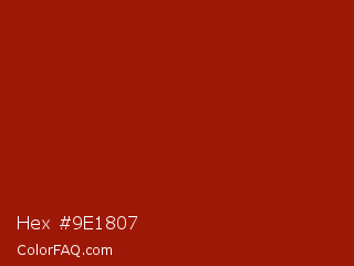 Hex #9e1807 Color is a normal red color and the nearest color is Totem Pole #991b07. Hex code #9e1807 and RGB value is rgb(158,24,7). In RGB color space, this color is composed of 62% red, 9% green, 3% blue, In CMYK color space, this color is composed of 0% cyan, 85% magenta, 96% yellow , 38% black , In HSL color space, this color has a hue angle of 7° , 92% saturation and 32% lightness.