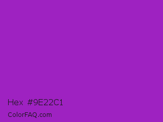 Hex #9e22c1 Color is a normal purple color and the nearest color is Dark Orchid #9932cc. Hex code #9e22c1 and RGB value is rgb(158,34,193). In RGB color space, this color is composed of 62% red, 13% green, 76% blue, In CMYK color space, this color is composed of 18% cyan, 82% magenta, 0% yellow , 24% black , In HSL color space, this color has a hue angle of 287° , 70% saturation and 45% lightness.