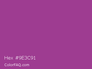 Hex #9e3c91 Color is a normal magenta color and the nearest color is Plum #8e4585. Hex code #9e3c91 and RGB value is rgb(158,60,145). In RGB color space, this color is composed of 62% red, 24% green, 57% blue, In CMYK color space, this color is composed of 0% cyan, 62% magenta, 8% yellow , 38% black , In HSL color space, this color has a hue angle of 308° , 45% saturation and 43% lightness.