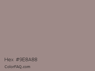 Hex #9e8a88 Color is a normal red color and the nearest color is Venus #928590. Hex code #9e8a88 and RGB value is rgb(158,138,136). In RGB color space, this color is composed of 62% red, 54% green, 53% blue, In CMYK color space, this color is composed of 0% cyan, 13% magenta, 14% yellow , 38% black , In HSL color space, this color has a hue angle of 5° , 10% saturation and 58% lightness.