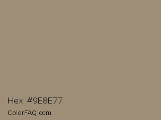 Hex #9e8e77 Color is a normal orange color and the nearest color is Pale Oyster #988d77. Hex code #9e8e77 and RGB value is rgb(158,142,119). In RGB color space, this color is composed of 62% red, 56% green, 47% blue, In CMYK color space, this color is composed of 0% cyan, 10% magenta, 25% yellow , 38% black , In HSL color space, this color has a hue angle of 35° , 17% saturation and 54% lightness.