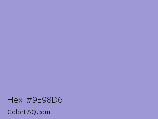 Hex #9e98d6 Color is a light indigo color and the nearest color is Blue Bell Crayola #9999cc. Hex code #9e98d6 and RGB value is rgb(158,152,214). In RGB color space, this color is composed of 62% red, 60% green, 84% blue, In CMYK color space, this color is composed of 26% cyan, 29% magenta, 0% yellow , 16% black , In HSL color space, this color has a hue angle of 246° , 43% saturation and 72% lightness.