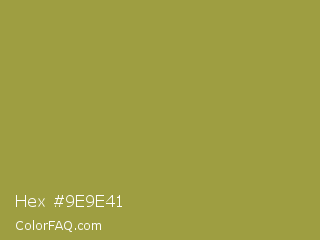 Hex #9e9e41 Color is a normal yellow color and the nearest color is Sycamore #908d39. Hex code #9e9e41 and RGB value is rgb(158,158,65). In RGB color space, this color is composed of 62% red, 62% green, 25% blue, In CMYK color space, this color is composed of 0% cyan, 0% magenta, 59% yellow , 38% black , In HSL color space, this color has a hue angle of 60° , 42% saturation and 44% lightness.