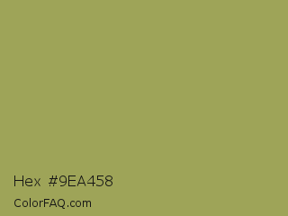Hex #9ea458 Color is a normal yellow color and the nearest color is Moss Green #8a9a5b. Hex code #9ea458 and RGB value is rgb(158,164,88). In RGB color space, this color is composed of 62% red, 64% green, 35% blue, In CMYK color space, this color is composed of 4% cyan, 0% magenta, 46% yellow , 36% black , In HSL color space, this color has a hue angle of 65° , 30% saturation and 49% lightness.