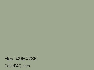 Hex #9ea78f Color is a light green color and the nearest color is Sage #9ea587. Hex code #9ea78f and RGB value is rgb(158,167,143). In RGB color space, this color is composed of 62% red, 65% green, 56% blue, In CMYK color space, this color is composed of 5% cyan, 0% magenta, 14% yellow , 35% black , In HSL color space, this color has a hue angle of 83° , 12% saturation and 61% lightness.